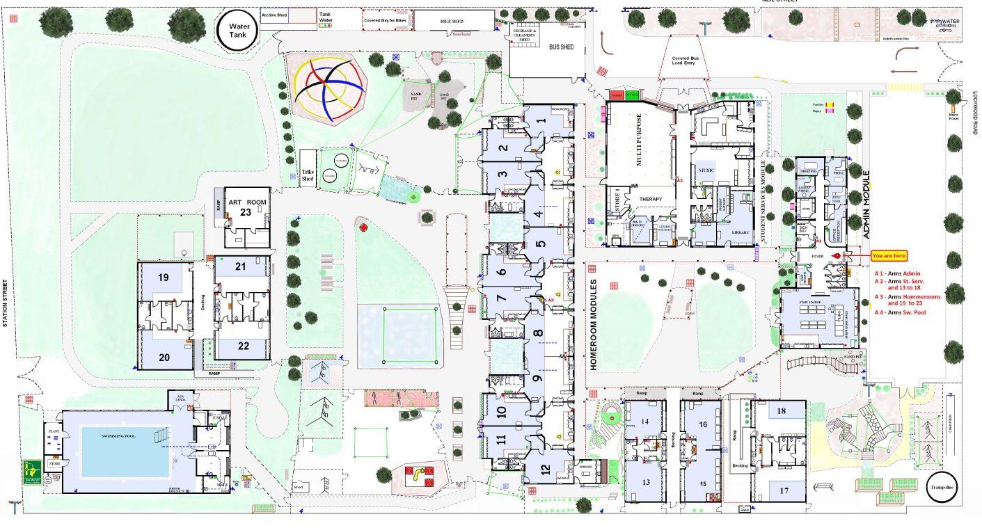 This is the overall layout of Bendigo Special Developmental School, showing the locations of all our classrooms and facilities.